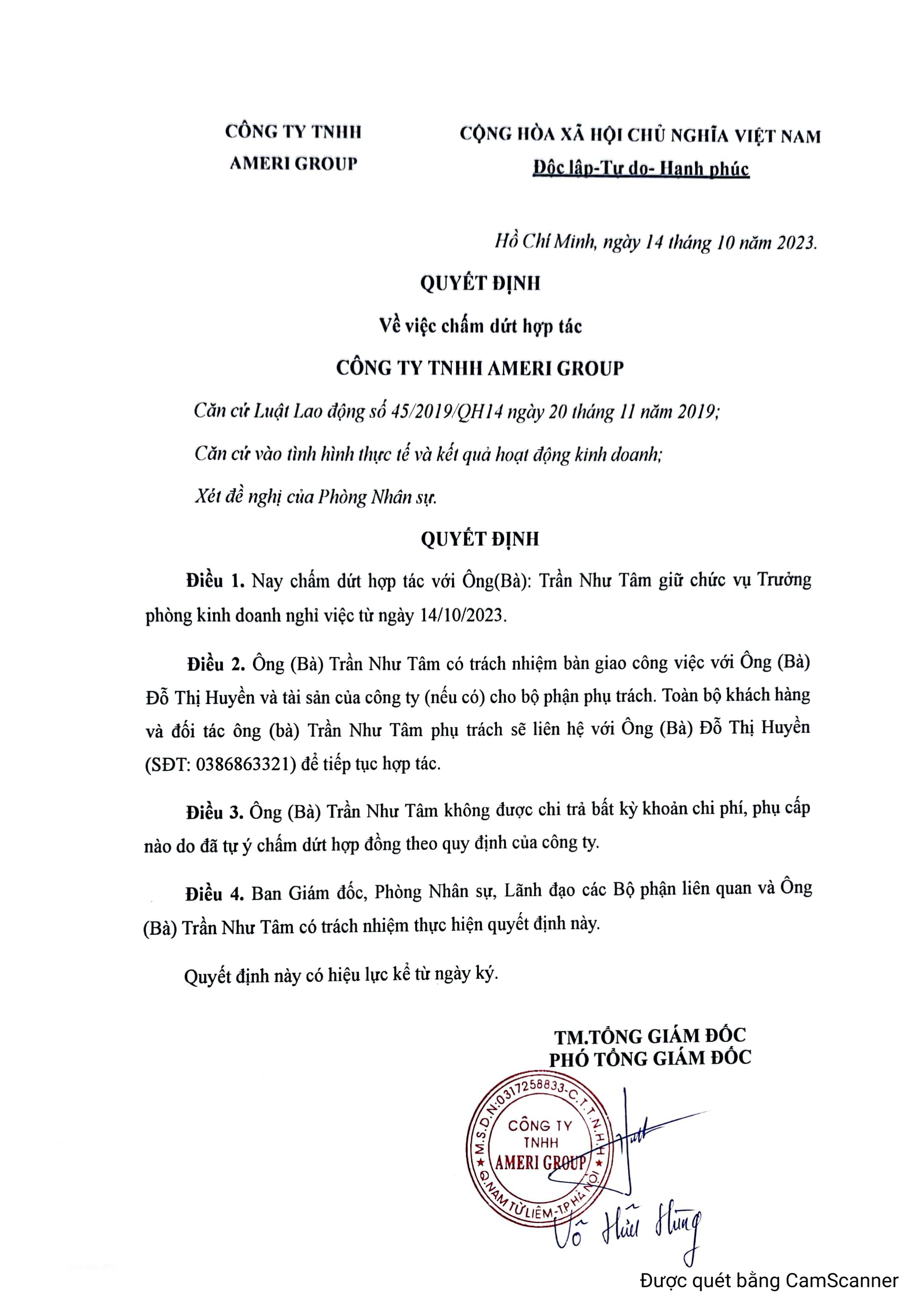 Vào ngày 14/10/2023 vừa qua, Ameri Group đã chính thức dừng hợp tác với Ông Trần Như Tâm, đảm nhiệm vị trí Trưởng phòng Kinh doanh kênh phân phối. Vì vậy, chúng tôi muốn thông báo đến quý đối tác, quý khách hàng của công ty để cập nhật thông tin liên hệ chính xác nhất, tránh thông tin sai lệch và quý đối tác, quý khách hàng được hỗ trợ nhanh chóng, chu đáo nhất.
